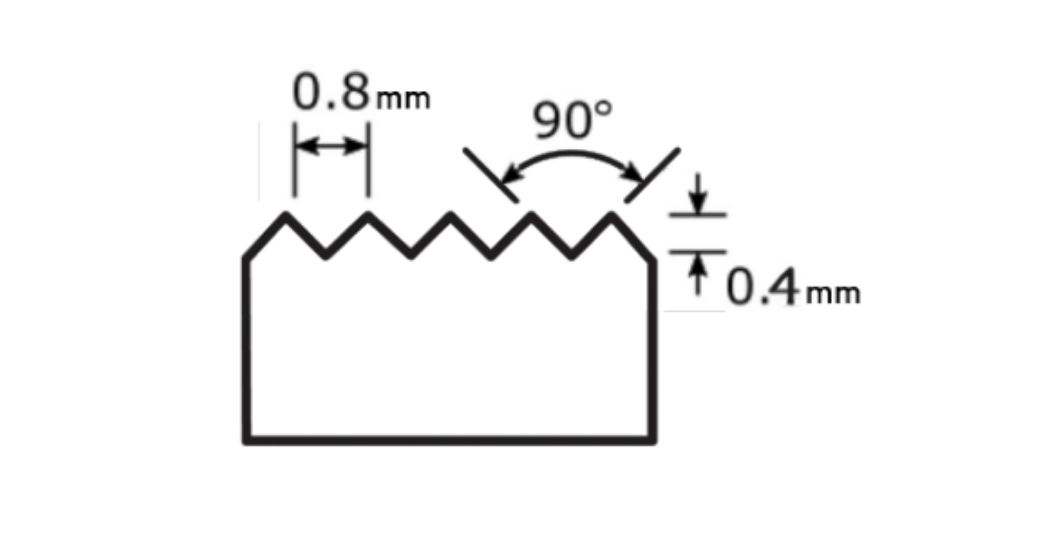 處理 螺旋鋸齒表面處理也是一個連續凹槽,類似于標準庫存表面處理,因為凹槽是使用 90° 夾角“V”工具生成的。對于所有尺寸,槽深 1/64”,進給深度為 1/32”。