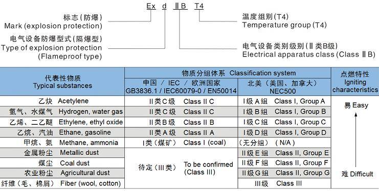 ExdIIBT4適用于II類B級(代表性物質(zhì):乙烯),溫度組別為T4及以下組的爆炸性氣體或粉末混合物存在的環(huán)境。